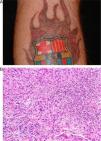 Patient 1Patient 1 was a 33-year-old man who had had a tattoo placed on his right leg 4 years previously. Three months before consulting, he had the shield outlined in black and a gray flame added. Asymptomatic lesions appeared 2 weeks later and were treated unsuccessfully with topical corticosteroids and antibiotics. The patient was then referred to the dermatology department.