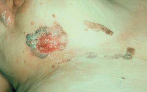 Figura 1. Tumor ulcerado, exudativo, con superficie pigmentada y queratósica en periferia y ulceración central, y varias lesiones tumorales de menor tamaño con un patrón de distribución lineal.