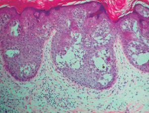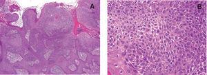 Figura 2 (A y B). Nidos de células tumorales localizadas en el seno de una epidermis acantósica que muestran atipia y mitosis (hematoxilina-eosina, x20, y hematoxilina-eosina, x100, respectivamente).