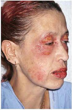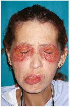 Se trata de una mujer de 43 años que ingresó en nuestro hospital por un cuadro que presentaba lesiones vesiculosas a nivel periorbitario y labial, con dificultad para la apertura palpebral y oral y para la alimentación. Asociaba artralgias no inflamatorias muy intensas en articulaciones de manos y rodillas, sin fiebre ni clínica general acompañante, que no cedían con la analgesia convencional. La paciente presentaba la clínica cutánea desde el año anterior, en forma de brotes sucesivos de lesiones vesiculosas, muy bien delimitadas en las regiones orbitaria y labial, que evolucionaban a la formación de costras, sin recuperación completa entre brotes. Por este motivo durante el último año había sido ingresada en tres ocasiones en otro hospital. Durante el segundo ingreso asoció una parálisis facial periférica izquierda que persiste en la actualidad, y que inicialmente orientó al diagnóstico de un síndrome de Melkersson-Rosenthal. Recibió tratamiento con corticosteroides tópicos y orales, minociclina y clofazimina, sin apreciarse clara mejoría.