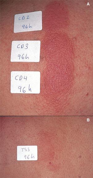 Fig. 2.--A) Prueba epicutánea positiva a las 96 h con CD2, CD3 y CD4. B) Prueba epicutánea positiva con TSS.