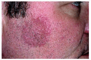Fig. 1.--Foliculitis pustulosa eosinofílica: placa circinada en una mejilla.