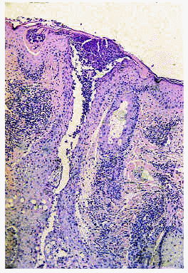 Desde el punto de vista histopatológico, en las etapas iniciales se observa espongiosis en la pared del infundíbulo folicular a expensas de un infiltrado de eosinófilos y células mononucleares. En etapas avanzadas del proceso se puede apreciar un auténtico clivaje o vesícula longitudinal, con neutrófilos, linfocitos y gran número de eosinófilos, que separa toda la pared infundibular (fig. 3) y afecta, con frecuencia, a la glándula sebácea (fig. 4)21. Algunas pústulas, primariamente intrafoliculares, se extienden secundariamente desde el infundíbulo hacia la epidermis vecina formando pústulas epidérmicas subcórneas10. Es posible encontrar, además, algún grado de degeneración mucinosa de la vaina epitelial externa22, 23.