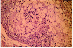 Los hallazgos histopatológicos son característicos y fundamentales para el diagnóstico de esta enfermedad. Se observa un infiltrado denso en la parte alta de la dermis que puede extenderse en profundidad, afectando incluso al tejido celular subcutáneo, y que está separado de la epidermis y de los anejos cutáneos por una banda estrecha de colágeno normal (zona Grenz). Este infiltrado es muy polimorfo y está constituido por eosinófilos, neutrófilos, linfocitos, histiocitos, células plasmáticas y, a veces, también por mastocitos.