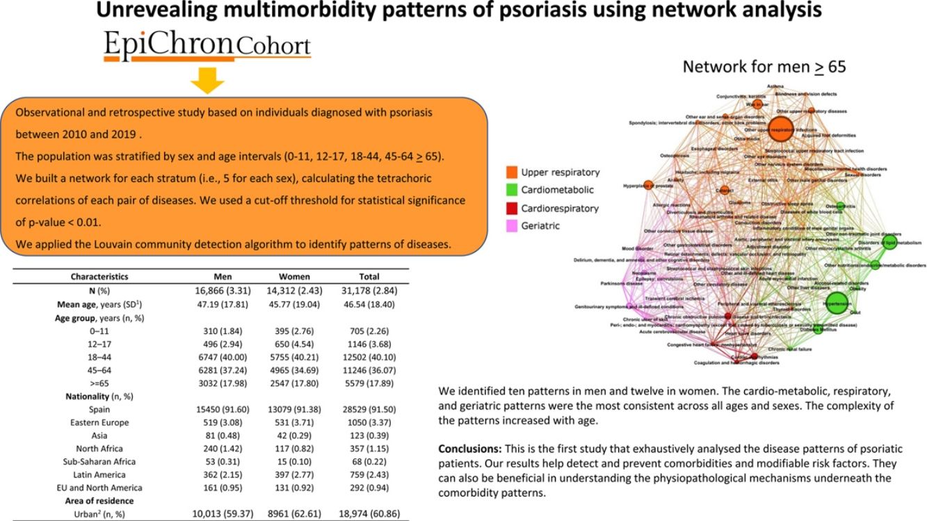 One of the main strengths of our study is that we analyzed a population-based cohort, including 98% of the reference population. Moreover, data from the EpiChron Cohort undergoes continuous quality control checkups ensuring its accuracy and reliability for research purposes. Another important strength is the innovative method applied to understand comorbidities in psoriasis. Network analysis studies the interrelations across diseases and how patterns emerge from them. This paper shows the potentiality of applying this method to study and visualize the comorbidities of psoriasis and achieve a more holistic understanding of these patients. Of note, this study comprehensively analyzed all chronic diseases obtained from the patient's EHRs created by health professionals, and not just the most relevant, prevalent or self-reported diseases.