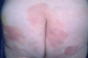 Fig. 9.—Placas diseminadas con tendencia a la ulceración en un paciente con linfoma cutáneo tipo paniculítico.