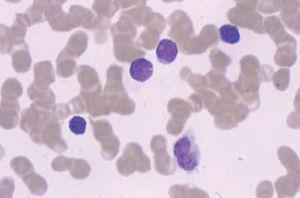 El síndrome de Sézary, la variante leucémica de la micosis fungoide, se manifiesta por la tríada de eritrodermia, linfadenopatías y más de 1.000 células linfoides atípicas circulantes (células de Sézary) por mm3. Dichas células son células mononucleares de tamaño moderadamente grande con núcleos convolutos (fig. 5). Los pacientes presentan un prurito generalizado de gran intensidad, refractario al tratamiento, ectropión, alopecia, distrofia ungueal, edema periférico, e hiperqueratosis palmoplantar. En la clasificación de la EORTC se considera como un linfoma cutáneo de células T de curso agresivo, progresa más rápidamente, y es más resistente al tratamiento que una micosis fungoide convencional. La médula ósea suele verse respetada a pesar del componente en sangre periférica54.