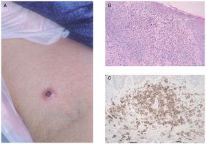 Linfoma primario cutáneo CD30+Dentro del espectro de procesos cutáneos primarios CD30+, en el polo opuesto a la papulosis linfomatoide, se encuentran los linfomas de célula grande CD30+. Desde el punto de vista clínico, su presentación más característica es en la forma de una única lesión tumoral, a veces con otras adyacentes de menor tamaño (fig. 7A). Ocasionalmente, las lesiones pueden presentar una regresión espontánea completa o parcial, aunque son frecuentes las recurrencias cutáneas. La diseminación extracutánea se detecta en alrededor del 10 % de los pacientes, principalmente a los ganglios linfáticos regionales y habitualmente en pacientes con una enfermedad cutánea multicéntrica64,68.