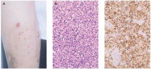 Fig. 7.—A) Lesiones nodulotumorales agrupadas correspondientes a un linfoma cutáneo de células grandes CD30+. B) Infiltrado denso, cohesivo, de células grandes atípicas. (Hematoxilina-eosina, ×200.) C) Marcada expresión del antígeno CD30 en las células neoplásicas.