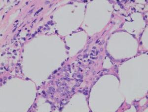 Histológicamente se observa un infiltrado linfoide atípico con un patrón difuso limitado al tejido celular subcutáneo de características similares a una paniculitis lobulillar. Las células linfoides son de características pleomórficas de tamaño pequeño o intermedio. Pueden observarse, asimismo, linfocitos grandes con núcleos irregulares e hipercromáticos y abundantes mitosis. De forma ocasional puede observarse una fagocitosis de los detritos nucleares y de fragmentos de hematíes por parte de histiocitos reactivos (hemofagocitosis). Esta observación parece ser un signo con valor pronóstico negativo. Con frecuencia se observa un patrón de destrucción de los adipocitos marginales característico, con invasión del panículo por las células neoplásicas. Son frecuentes la infiltración y lesiones vasculares, que provocan amplias zonas de necrosis (angiocentricidad) (fig. 10).