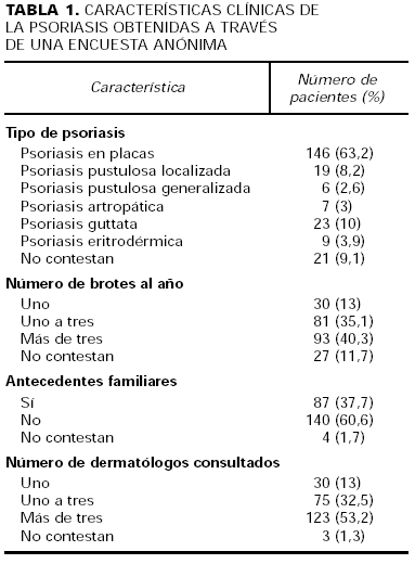El 54,1% de los encuestados eran hombres y el 45,9% mujeres. La edad media de los sujetos fue de 43 años (rango entre 5 y 80 años) y la edad media de inicio de la psoriasis fue de 25 años (rango entre 2 y 76 años). En la tabla 1 se resumen los resultados obtenidos en las preguntas referentes a las características clínicas y evolutivas de la psoriasis y en la tabla 2 se expone el grado de información acerca de su dermatosis entre nuestros encuestados.