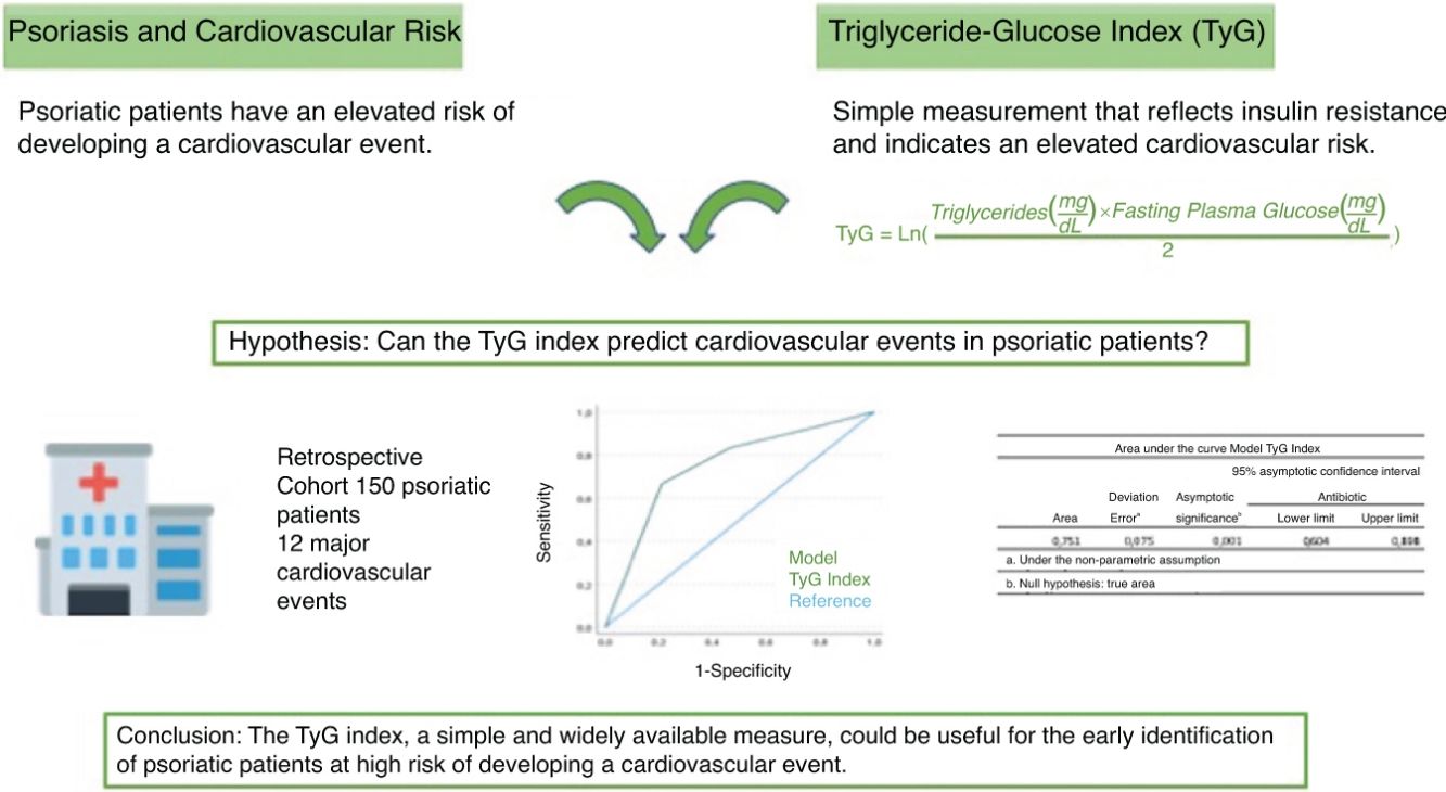 La psoriasis se asocia consistentemente con un elevado riesgo cardiovascular. Sin embargo, se necesitan parámetros bioquímicos para predecir eventos cardiovasculares en estos pacientes. Por ello, se llevó a cabo un estudio de cohorte retrospectivo de pacientes con psoriasis en tratamiento sistémico, en los que se analizó el valor del índice triglicéridos-glucosa (TyG) para el desarrollo de eventos cardiovasculares adversos mayores (MACE, por major adverse cardiovascular events). Se seleccionaron 150 pacientes en los que, tras una mediana de 17 meses, se presentaron 12 MACE (11 infartos y un ictus). El cuartil de valor más elevado del índice TyG se asoció con un mayor riesgo de desarrollar MACE (HR: 9,3; IC 95%: 1,1-78,9). La capacidad predictiva del índice TyG para predecir los eventos mostró un área bajo la curva de 0,75 (0,60-0,90), p=0,001. Estos resultados evidencian que el índice TyG podría ser útil para identificar tempranamente a los pacientes con psoriasis que tienen un alto riesgo de desarrollar un MACE.
