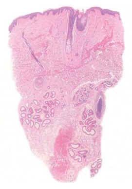 Una mujer de 16 años de edad, sin antecedentes familiares ni personales de interés, que consultó por presentar, desde hacía aproximadamente 3 meses, lesiones papulosas hiperqueratósicas perifoliculares, de 1-2 mm de diámetro, en axilas, formando placas de límites bien definidos, de forma bilateral y simétrica (fig. 1). Estas lesiones eran levemente pruriginosas. Se observaba una disminución del vello axilar. Existían también lesiones similares menos llamativas en areolas mamarias y región púbica. Se realizó biopsia cutánea de las lesiones axilares, que mostró espongiosis en el punto de entrada de la glándula apocrina en el epitelio infundibular, coincidiendo con un tapón córneo suprayacente, y un ligero infiltrado inflamatorio perifolicular (figs. 2 y 3). No presentaba ningún trastorno en las hormonas sexuales ni estaba tomando anticonceptivos orales. Dada la escasa sintomatología, se mantuvo una actitud conservadora y se pautó corticoterapia tópica en caso de cursar con prurito.