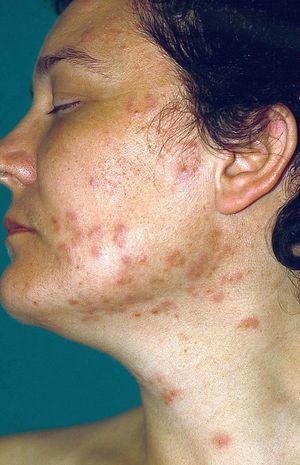 La FPF o enfermedad de Ofuji se caracteriza por la aparición de brotes recurrentes de pápulo-pústulas foliculares estériles, que configuran placas de morfología anular o circinada y que tienden a la progresión centrífuga y a la involución central 10. La distribución preferente de las lesiones es en las zonas más seborreicas de la piel: cara, tronco y la superficie de extensión de las extremidades superiores 11,12. Existe también afectación palmoplantar en la quinta parte de los pacientes, que en ocasiones incluso puede ser la única manifestación 13. El prurito y la eosinofilia periférica son hallazgos bastante habituales, se encuentran en el 50 % de los casos 10. Desde el punto de vista histopatológico, existe un infiltrado no sólo folicular, sino además perifolicular y perivascular. A nivel del infundíbulo folicular se puede apreciar espongiosis y posterior vesiculación de la vaina epitelial externa a expensas de un infiltrado de eosinófilos y algunas células mononucleares. La glándula sebácea suele estar afectada y a veces se llega incluso a su destrucción 14,15.