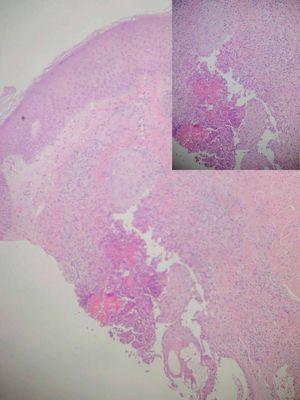 Mujer de 35 años sin ningún antecedente médico-quirúrgico de interés y sin tratamiento farmacológico habitual, que consultó por una dermatitis pruriginosa de 4 meses de evolución, refractaria a diversos tratamientos prescritos (antibióticos y corticoides orales, así como dapsona). La erupción se inició en glúteos y posteriormente se fue extendiendo a cara, tronco y extremidades. La exploración cutánea reveló la presencia de múltiples pápulas y pústulas foliculares, que llegaban a formar placas en alguna zona y se apreciaba en otras un crecimiento excéntrico, adoptando una morfología anular. Afectaba principalmente la cara, cuello y tronco, pero también las extremidades superiores e inferiores, incluyendo además ambas palmas de las manos (figs. 1 y 2). No presentaba adenopatías, ni se palpaban organomegalias. El cuadro clínico evolucionaba de forma progresiva, con aparición de nuevas lesiones, persistiendo muchas de ellas, e involucionando otras dejando hiperpigmentación residual. Se habían realizado 2 biopsias en otro centro con diagnóstico histológico de dermatosis pustular subcórnea. En nuestro Servicio se efectuaron nuevas biopsias y en todas ellas se apreciaban hallazgos semejantes, con pústulas subcorneales sin ninguna relación con folículos, acompañadas por un denso infiltrado eosinofílico. Continuaron realizándose estudios histológicos hasta demostrar la presencia de un infiltrado de leucocitos polimorfonucleares con elevada proporción de eosinófilos a nivel del infundíbulo, llegando a destruirlo en alguna zona (fig. 3). Este infiltrado también se observaba focalmente en las glándulas sebáceas y producía en alguna ocasión espongiosis, pústulas y/o abscesos foliculares eosinofílicos.