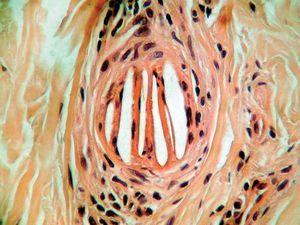 Fig. 2.—Cristales de colesterol enclavados intraluminalmente en una arteriola de la dermis profunda. Se observa un engrosamiento de la íntima y fibrosis perivascular asociada. (Hematoxilinaeosina, ×100.)