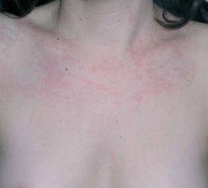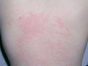 Mujer de 29 años, sin antecedentes de interés, que acudió al Servicio de Urgencias de nuestro hospital por fiebre, poliartralgias y exantema de tres semanas de evolución. Había sido tratada por su médico de cabecera con amoxicilina-clavulánico durante 10 días, pero no había mejorado. Presentaba dolor faríngeo y fiebre alta, de 39° C, que aparecía de forma intermitente. Se acompañaba de poliartralgias y rigidez articular matutina de una hora de duración. Presentaba un exantema pruriginoso que precedió a la aparición de la fiebre. Las lesiones cutáneas se iniciaron en la espalda y se extendieron a la cara anterior del cuello y al escote. Permanecían fijas, en la misma localización durante los días previos a su llegada a Urgencias (aproximadamente 14 días). No refería la toma de fármacos sospechosos. Las lesiones cutáneas no eran dolosas ni dejaban hipo/hiperpigmentación posterior. No tenía afectación palmo-plantar.