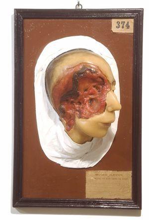 Este molde posee la peculiaridad de haberse realizado directamente sobre el paciente, que en este caso y por medio del historial conservado sabemos que había fallecido. La coloración y aspecto seroso de la lesión son originales, si bien durante el proceso de restauración se procedió a avivar los pigmentos preexistentes mediante veladuras y aplicación de barniz.