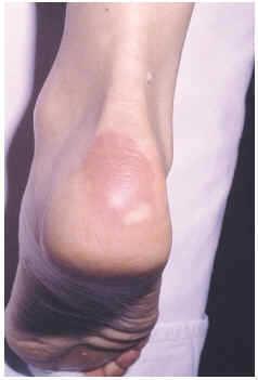 Fig. 2.--Paciente 1: placas eritematovioláceas sobre la piel que recubre el tendón de Aquiles.