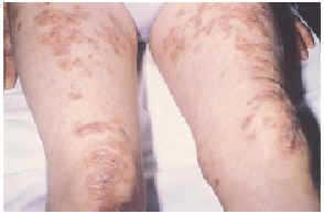 Una mujer de 46 años de edad con antecedentes personales de alergia a penicilina y ácido acetilsalicílico, síndrome de Sjögren, mielitis cervical autoinmune y artritis reumatoide en tratamiento con prednisona de 10 mg al día consultó por lesiones persistentes, discretamente pruriginosas, de unos 10 meses de evolución, localizadas en ambas rodillas, que habían sido tratadas previamente con corticoides tópicos sin mejorar.