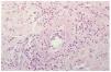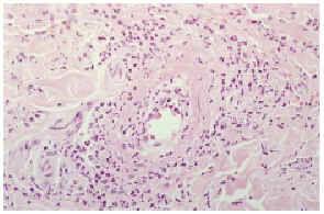 Fig. 6.--Eritema elevatum diutinum: vista con gran aumento que muestra edema endotelial y necrosis fibrinoide de la pared de los vasos.