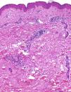 En la exploración se observaba una placa semicircular eritematosa de 20×15cm localizada en la zona abdominal, con un borde papular bien delimitado y una zona de aclaramiento central (fig. 1). El examen histológico únicamente mostraba un infiltrado inflamatorio perivascular compuesto principalmente por linfocitos, que afectaba a la dermis superficial y media. La epidermis y la dermis profunda no presentaban alteraciones (fig. 3). Se realizó una analítica sanguínea con hemograma y bioquímica y se solicitaron autoanticuerpos, con resultado dentro de la normalidad.