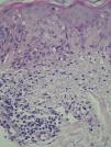 At 3 weeks, the lesions had progressed to confluent annular erythematous-violaceous plaques on the above-mentioned sites (fig. 1). The biopsy revealed hyperkeratosis in the epidermis, epidermal atrophy, degeneration of the basal layer, lymphocytic exocytosis, spongiosis, and occasional necrotic keratinocytes. A superficial perivascular lymphohistiocytic inflammatory infiltrate was observed in the dermis (fig. 2). Based on clinical and microscopy findings, the patient was diagnosed with subacute cutaneous lupus erythematosus (SCLE).
