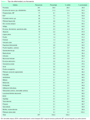 En el trabajo presentado, la dermatosis tratada con mayor frecuencia fue la psoriasis, seguida del eccema palmo-plantar, circunstancia que coincide con el estudio sueco de Lindelöf et al7, aunque contrasta con los resultados del trabajo de Tran et al8, en Singapur, en donde el vitíligo representaba la primera causa de tratamiento. Este hecho subraya las diferencias en la prevalencia de estas dermatosis en distintos ámbitos geográficos. Mientras que en nuestro trabajo la MF supone un 8,1 % de todas las patologías, en el estudio sueco sólo supone el 3 % y en el de Singapur el 3,5 %.