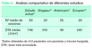 Los datos referentes al número medio de sesiones y a la DTA de los pacientes con PUVA sistémico en comparación con los de otros países se recogen en la tabla 6.