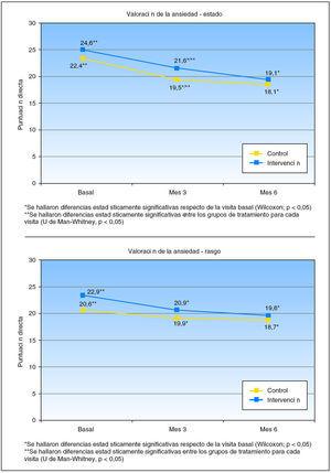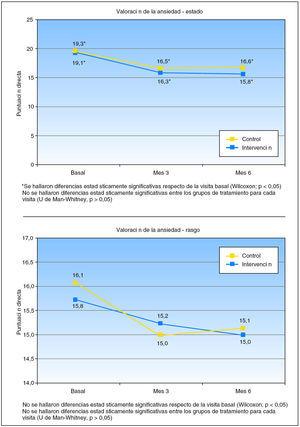 En la valoración de la ansiedad-STAI de pacientes adultos (mayores de 15 años), en cambio, se apreciaron diferencias significativas entre ambos grupos en la visita basal y a los tres meses en las puntuaciones directas, pero no en las puntuaciones corregidas. Así, el GI presentó niveles de ansiedad (tanto en ansiedad rasgo como estado) significativamente más elevados que el GC al inicio del estudio, mientras que al final no se observaron diferencias entre ambos grupos.