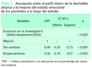 La mejora emocional del paciente con DA está significativamente asociada con la mejoría clínica valorada a través de la IGA. Sin embargo, el estudio no aporta información del tratamiento farmacológico seguido por los pacientes y que probablemente haya influido en la mejora clínica y por tanto, emocional.