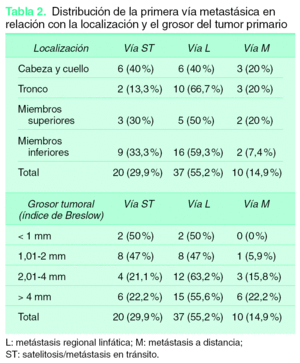 La mayor frecuencia de satelitosis/metástasis en tránsito como primera vía metastásica ocurre en melanomas menores de 2 mm, mientras que la mayor frecuencia de la vía primaria hacia metástasis sistémicas ocurre proporcionalmente al grosor tumoral. Las metástasis linfáticas regionales tienen su máxima frecuencia como primera vía metastásica en melanomas con un grosor comprendido entre 2,01-4 mm. Actualmente no se dispone de marcadores que justifiquen esta variabilidad en las distintas vías metastásicas dependiendo del grosor tumoral, aunque está bastante bien establecido que a mayor grosor mayor capacidad de metástasis sistémicas. No está explicado por qué no sigue la misma frecuencia proporcional la satelitosis/metástasis en tránsito y las metástasis linfáticas regionales.