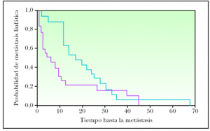 El análisis estadístico se llevó a cabo mediante el sistema SPSS 12.0 para Windows. Las diferencias entre las distribuciones se evaluaron mediante la Chi-cuadrado o la prueba exacta de Fisher, según fuera necesario. La comparación entre variables cuantitativas se realizó con la t de Student. La probabilidad de metástasis en la comparación de grupos se realizó por el método de Kaplan-Meier. Las diferencias estadísticas se consideraron positivas con una p < 0,05.