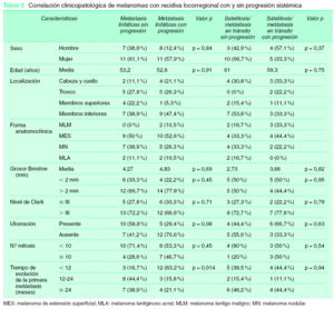 Por último, dentro de los grupos de pacientes que progresaron como primera vía metastásica a satelitosis/metástasis en tránsito o a metástasis linfáticas regionales, se compararon una serie de características clínicas e histopatológicas entre los casos que progresaron a enfermedad sistémica y los que no progresaron.