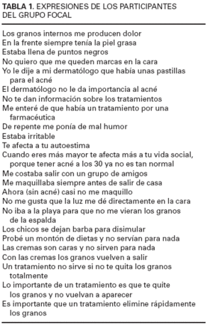 Las participantes de nuestro grupo focal se sintieron cómodas debido a que existía un vínculo común a todas ellas, que era su patología y su forma de actuar hacia su enfermedad. De las interacciones entre las participantes se han podido conocer aspectos no encontrados en la literatura especializada y que han servido para elaborar el contenido del cuestionario, basado exclusivamente en las opiniones de las pacientes. Todas ellas habían experimentado y utilizado las mismas técnicas para disimular sus lesiones (maquillaje, evitar zonas con luz directa, etc.) que también servían como indicadores subjetivos de la efectividad del fármaco y, por tanto, del grado de satisfacción con el tratamiento. En cuanto a las expectativas de las pacientes hacia su tratamiento, es interesante destacar que unánimemente éstas no se cumplían si no había una desaparición total de las lesiones, por lo que cabe destacar el alto grado de exigencia con los tratamientos para el acné que tenían las participantes. En cuanto al impacto del acné en la vida social y a nivel emocional, las opiniones de las participantes en el grupo focal eran muy similares a las encontradas en la literatura médica14,15.
