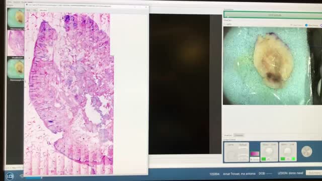 La microscopia confocal ex vivo es un sistema de procesamiento de tejidos que permite el análisis histológico inmediato de tejidos extirpados por medio de láseres diodo con distintos espectros de longitud de onda. En estudios previos la MCev reduce el tiempo de análisis de márgenes de forma muy notable, con una sensibilidad y especificidad respecto a la histopatología del 88% y 99% respectivamente. Recientemente se ha desarrollado una nueva tecnología que es capaz de proveer imágenes digitales con mayor velocidad y mejor resolución que las obtenidas en los dispositivos previos. Mediante el método de fusión (láseres de fluorescencia y reflectancia que escanean simultáneamente), se reproduce con una tinción digital la hematoxilina y eosina de forma inmediata en cada imagen. La implementación de esta nueva tecnología ha abierto definitivamente una puerta en el diagnóstico inmediato de tejidos.