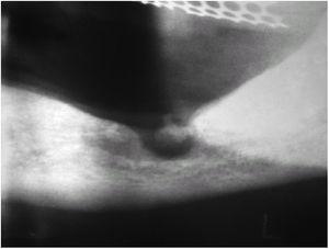 Se realizó una radiografía simple mandibular posteroanterior y lateral en la que no se apreciaba afectación ósea. Sin embargo, en la ortopantomografía se observaba, en el arco mandibular izquierdo, un foco de osteólisis que llegaba a destruir en el margen superior la cortical ósea, rodeado de una reacción perióstica con neoformación de hueso laminar (fig. 2).