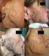 A) Placa indurada subcutánea de 2,5×3cm de diámetro en región parotídea. B) Fístula parotídea a los 7 días de la biopsia cutánea, con salida de saliva por el defecto. C) Fístula parotídea a las 3 semanas de tratamiento, previo al tratamiento con toxina botulínica. Se realizaron inyecciones subcutáneas alrededor del defecto en los 6 puntos delimitados en la imagen. D) Resultado final posterior al tratamiento con toxina botulínica.