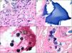 Biopsia cutánea compuesta principalmente por tejido glandular parotídeo y 4 materiales sintéticos distintos (H&E). A) Material fusiforme grisáceo inmerso en un estroma hialino compatible con ácido poliláctico que infiltra tejido glandular parotídeo. B) Material basófilo laminado polimorfo compatible con ácido hialurónico. C) Microesferas negro-grisáceas compatibles con hidroxiapatita cálcica. D) Material espumoso basófilo no identificado.