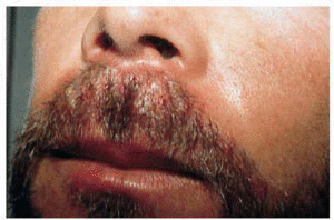 Varón de 34 años de edad, sano, que consultó por una erupción pustulosa de 2 días de evolución localizada en la piel del labio superior. Las lesiones habían aparecido coincidiendo con la práctica de sexo oral con su mujer, la que gozaba de buena salud y no presentaba lesiones genitales, aunque no fue examinada.