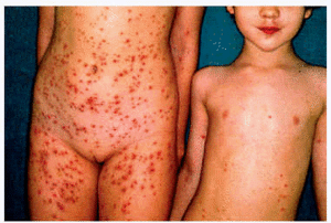 Fig. 1.--Lesiones papuloeritematosas y pustulosas en tronco y extremidades de los dos hermanos, con diferente grado de afectación.
