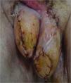 Al ingreso el 54,05% de los pacientes presentaba afectación escrotal, el 37,83% del periné, el 30% de la zona perianal, el 27,02% del pene, el 16% de la zona suprapúbica y el 5,4% del hipogastrio. El 100% de los pacientes presentaba algún grado de edema en el pene o el escroto, fiebre el 75,6%, eritema el 71,4% y zonas de necrosis el 46% (fig. 1).