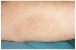 Fig. 2.--Paciente 2. Mácula eritematopardusca en la cara interna del codo izquierdo.