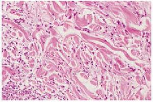 Los hallazgos histológicos eran similares en todos los casos: un moderado infiltrado linfohistiocitario intersticial localizado en la dermis superficial con fibras de colágeno degenerado (figs. 3 y 4). También se observó depósito de mucina entre la necrobiosis.
