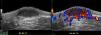 Ecografía Doppler color de la mejilla izquierda en un paciente con GAFI. A)En escala de grises se observa una formación hipoecogénica ovalada dérmica (entre marcadores) con su segmento profundo siguiendo el eje de los planos cutáneos y con un refuerzo acústico posterior. B)El estudio Doppler color muestra un aumento de vascularización (en colores) dérmico y subcutáneo en la periferia de la formación ovalada.