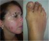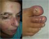 A 38-year-old woman visited our department with inflammation and pain in the toes of the right foot, accompanied by abnormal nails, which had appeared 3 months earlier. The patient presented erythematous, lupoid facial lesions that had appeared a year earlier and were associated with bilateral enlarged cervical lymph nodes. Examination revealed erythema with edema and swelling in the first 3 toes of the right foot, associated with dystrophic toenails, and erythematous lesions with adhered crusts on the nose, forehead, and cheeks (Fig. 1).