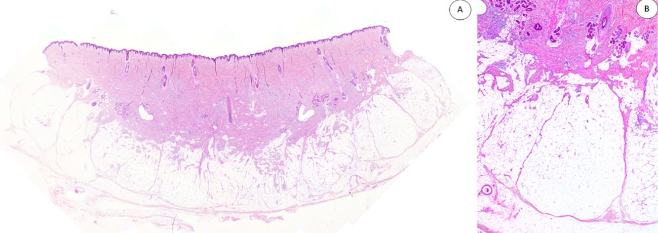 Los casos se caracterizaban por presentar una morfología trifásica con una proporción variable de tejido fibroblástico/miofibroblástico, mesenquimal inmaduro y adiposo maduro en dermis o subcutis (figs. 1, 2 y 3). En términos generales, las lesiones se describieron como mal delimitadas (fig. 1).