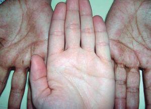 Figura 1. Hiperpigmentación palmar, más marcada en pliegues, comparada con una mano del explorador.