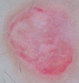 El estudio de la lesión mediante dermatoscopia (fig. 1) mostró vasos ramificados de predominio periférico y estructuras blanquecinas que recordaban un retículo blanco sobre un fondo de estructuras homogéneas eritemato-violáceas y ausencia total de retículo pigmentado, puntos, glóbulos o velo azul-blanco.