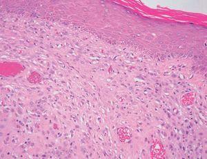 Se realizó una biopsia escisional de la lesión que se estudió con una tinción de hematoxilina-eosina y diferentes técnicas inmunohistoquímicas. Se trataba de una lesión exofítica, bien circunscrita, localizada fundamentalmente en la dermis papilar que no tenía anejos cutáneos. La epidermis que la cubría carecía de crestas y formaba un collarete que delimitaba la lesión sin conectar con ella.